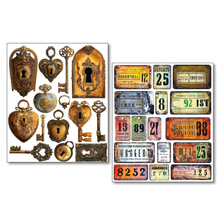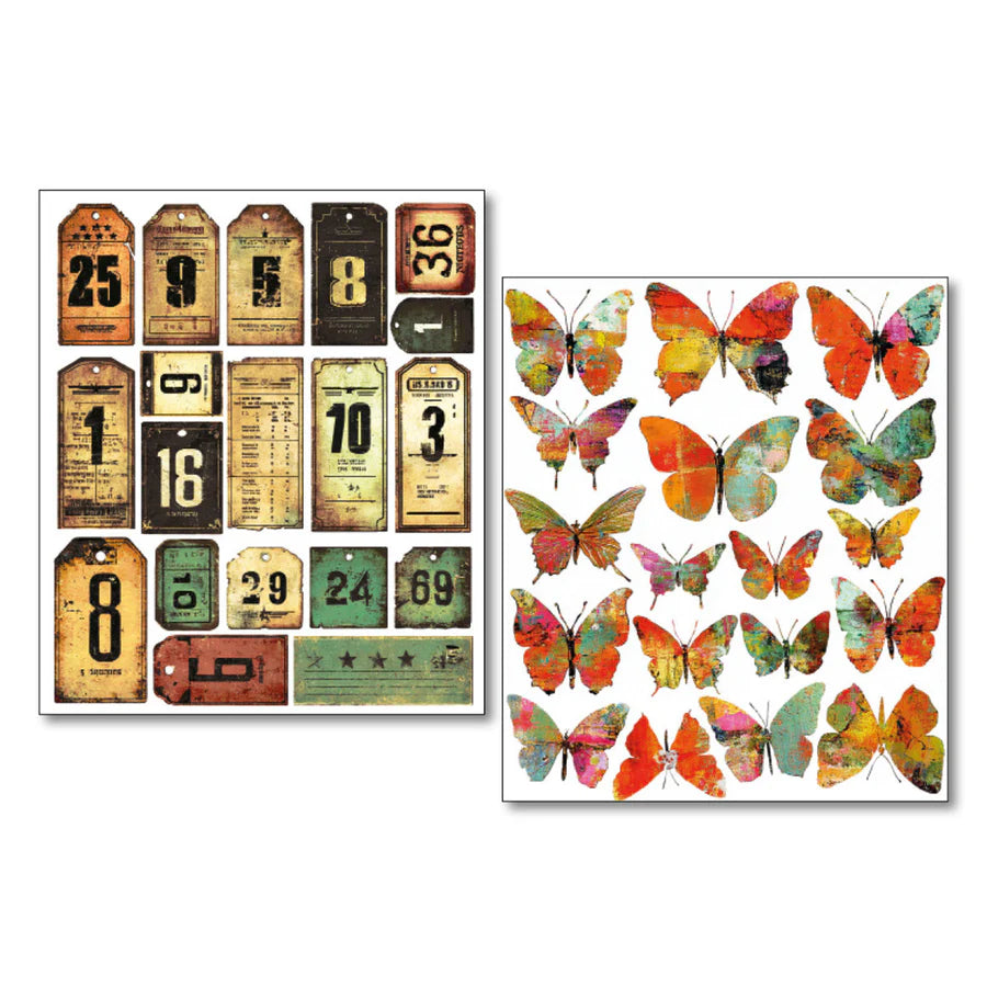 A set of 10 assorted uncut transparent adhesive sheets featuring tags and labels with a vintage rustic feel. The stickers are perfect for mixed media, collage, junk journal, scrapbooking and paper craft arts.