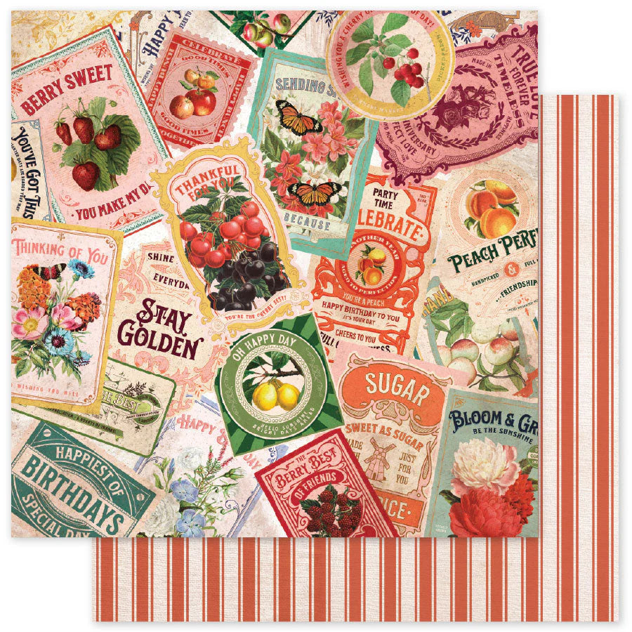 The Meadowbrook Farm Basics Collection captures the essence of farm life with hues of red, green, blue and yellow. This collection showcases detailed illustrations of colourful flowers, vintage canning labels, plus a variety of fruits such as raspberries, peaches and apples as well as some coordinating papers in stripe and check patterns. This collection offers a rich, authentic countryside aesthetic ideal for crafting projects that celebrate rustic charm and harvest themes.