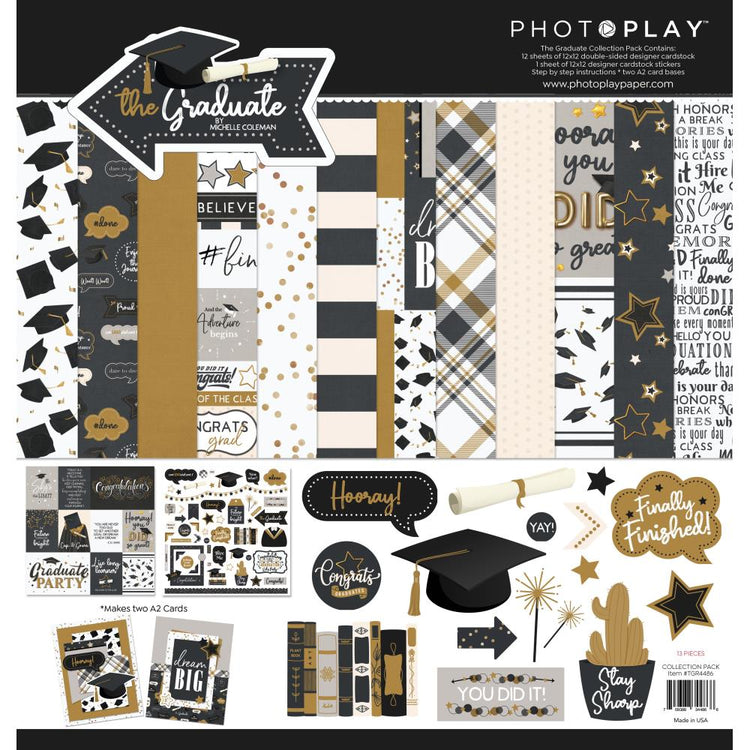 Celebrate the grad in your life with our new The Graduate collection. This mini collection features eight designer patterns, a collection pack and 12x12 element stickers, each sold separately. This collection pack contains twelve sheets of 12x12 double-sided 65# cardstock (two each of six designs) and one 12x12 cardstock sticker sheet. Acid and lignon free. Made in the USA.