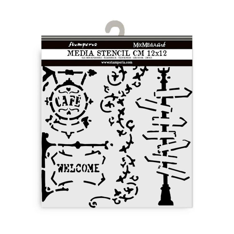 Stamperia Stencil 4.72"X 4.72" Art of Traveling Lamp and Signs